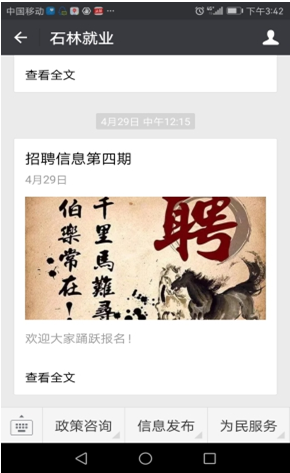 石林县认真落实省、市就业工作相关要求,结合实际,创新就业服务工作方式、方法,利用“石林就业”微信平台,实现“线上招聘”与“线下招聘”无缝衔接,为用工企业和求职者搭建便捷就业服务供需平台。今年4月以来,建立石林就业“每周招聘会”招聘新模式,经过职业介绍窗口严格审核把关,每周为招聘单位发布一期招聘信息,将招聘企业、招聘工种、招聘人数、薪资待遇、购买保险情况和招聘企业联系电话等通过“石林就业”微信公众平台发布出去,让求职人员直接与招聘单位直接进行交流,达成用工协议,缩短了中间环节,提高了企业招聘效率,降低了求职成本。截至目前,石林县利用“石林就业”微信公众平台已发布用工信息四期、招聘企业48家、招聘工种121类、招聘人数578人,招聘信息关注度和转发率高,每期招聘信息点击人数均上千人,“每周招聘会”得到用工企业和求职者的高度认可和一致好评。