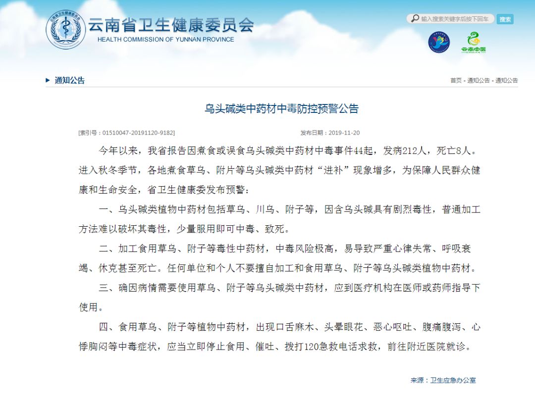 今年以来,云南省报告因煮食或误食乌头碱类中药材中毒事件44起,发病212人,死亡8人。冬季,我省部分地区民间有煮食草乌、附片等中药材“进补”的习俗,也有部分民众将其制作成药酒服用,以滋补身体。但此类药材如果加工不当(时间、温度、过程)、食(饮)用过量,可能会引起食用者中毒,甚至死亡。我省冬季常出现此类药材中毒的事件,现在就让我们来正确认识乌头类植物中毒。