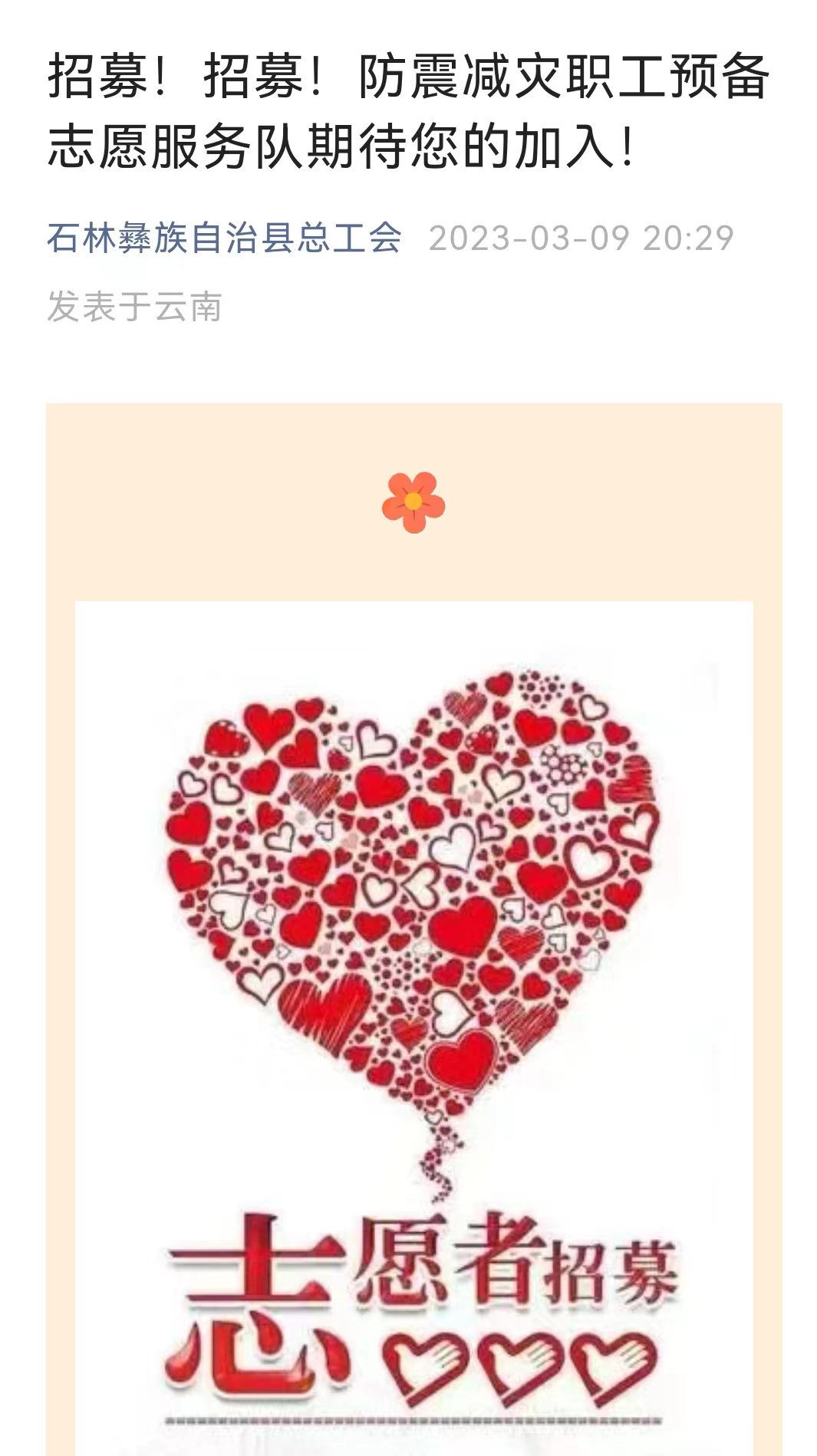 组建队伍强服务。依托石林县新时代文明实践职工志愿服务大队,及时发出招募令,在全县范围内招募300名防震减灾职工预备志愿者,其中,机关事业单位职工、企业职工和新就业形态劳动者各分别招募100名,服务队采取自愿报名的方式,充分结合实际,根据地震应急志愿服务工作的需求,志愿者在平时将协助做好地震应急知识宣传普及和地震应急演练,一旦发生地震,将协助开展灾情摸排、隐患排查、秩序维护、帐篷搭建、物资发放、服务咨询、卫生清扫等志愿服务。其中,专门设置了一支新就业形态志愿服务队,充分发挥快递员、网约送餐员等就业形态劳动者在救灾工作中的特殊优势,广泛动员社会力量参与防震救灾工作。