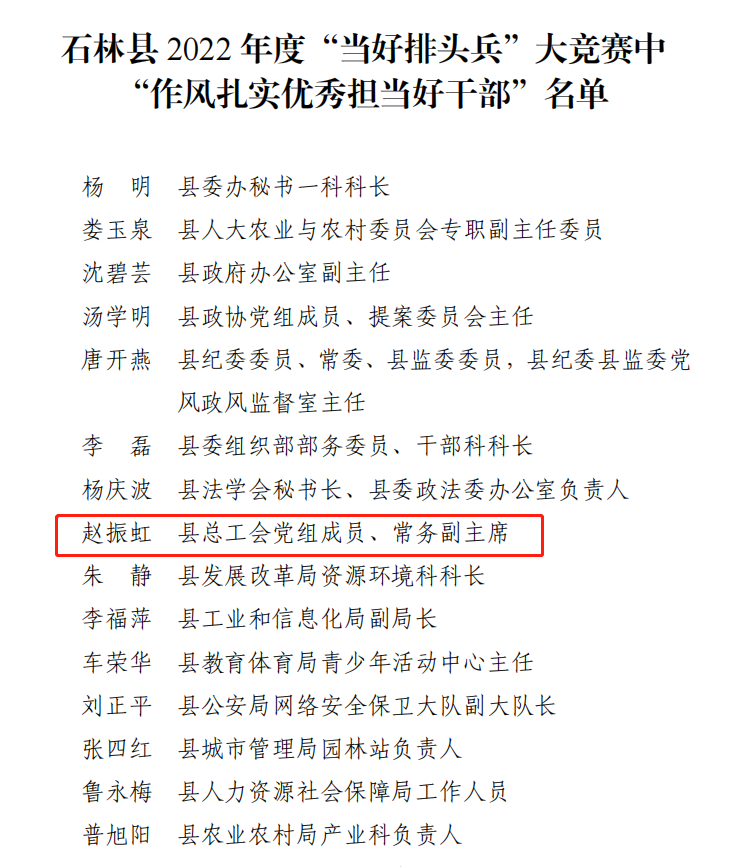 近日,中共石林县委、县人民政府发文表扬 2022 年度“当好排头兵”大竞赛中实绩突出的模范单位和“作风扎实优秀担当好干部”,对在大讨论大竞赛活动中表现突出、成绩优异的 10 个集体、20 名个人给予表扬。石林县总工会常务副主席赵振虹获评“作风扎实优秀担当好干部”,是全县群团组织中唯一获此殊荣的领导干部。