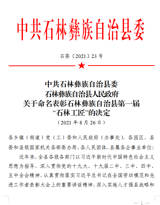 近日,石林县委、县政府印发《关于命名表彰“石林彝族自治县劳动模范和先进工作者”的决定》,授予县城市管理局环卫工官卫华等7名同志为石林县先进工作者,授予云南云岭红基文化传播有限公司总经理李翠英等3名同志为石林县劳动模范。