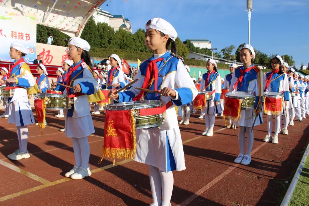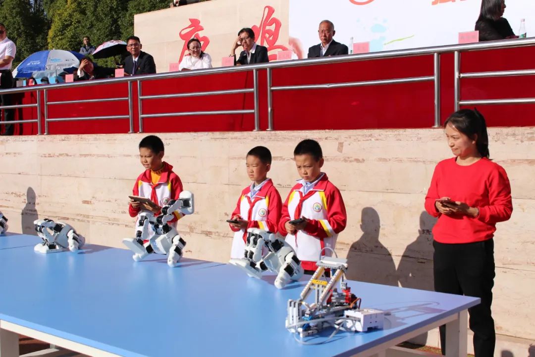 跟随跳动的音符、舒展青春的身姿,千人大课间操表演用别样方式诠释着青春与活力。伴随着慷慨激昂的鼓声,小学部原创群舞表演《深岭狮唤》带来天籁狮音,睡狮猛醒,欢腾嬉戏,福泽彝乡。无人机、机器人表演带领大家领略科技魅力,展示出新时代少年爱科学、学科学、用科学的热情。师生气排球表演描绘出一幅生机勃勃、活力四射的运动图景,将现场气氛推向高潮。