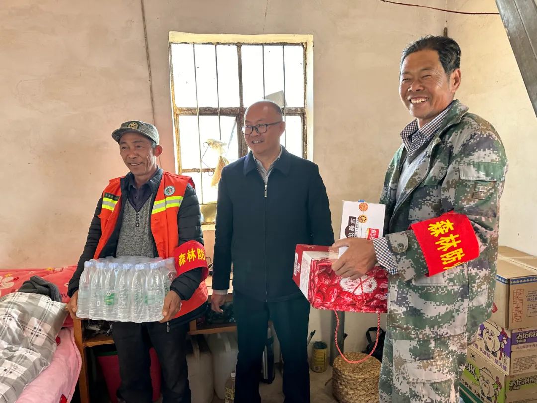 在松子园村“石老人”防火值守点、滇东南石漠化综合治理森林防火消防水池施工点,陈瑞斌一行详细了解森林防火消防水池施工进展情况,护林防火监测工作、护林员值班巡逻等情况。并来到护林员宿舍,为他们送上方便面、牛奶等慰问品,关切地询问他们外出巡护冷不冷,吃得好不好,住的宿舍暖不暖,同时叮嘱他们要加强巡逻检查,做好值班值守,消除火险隐患。