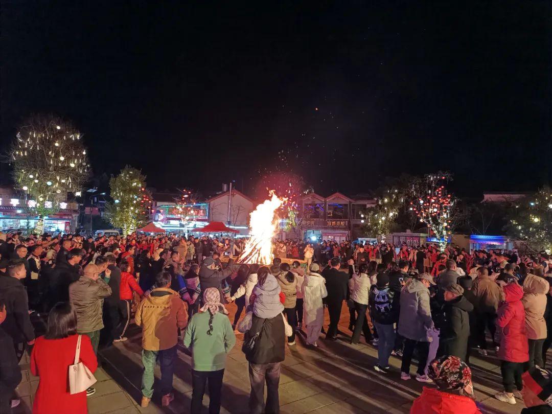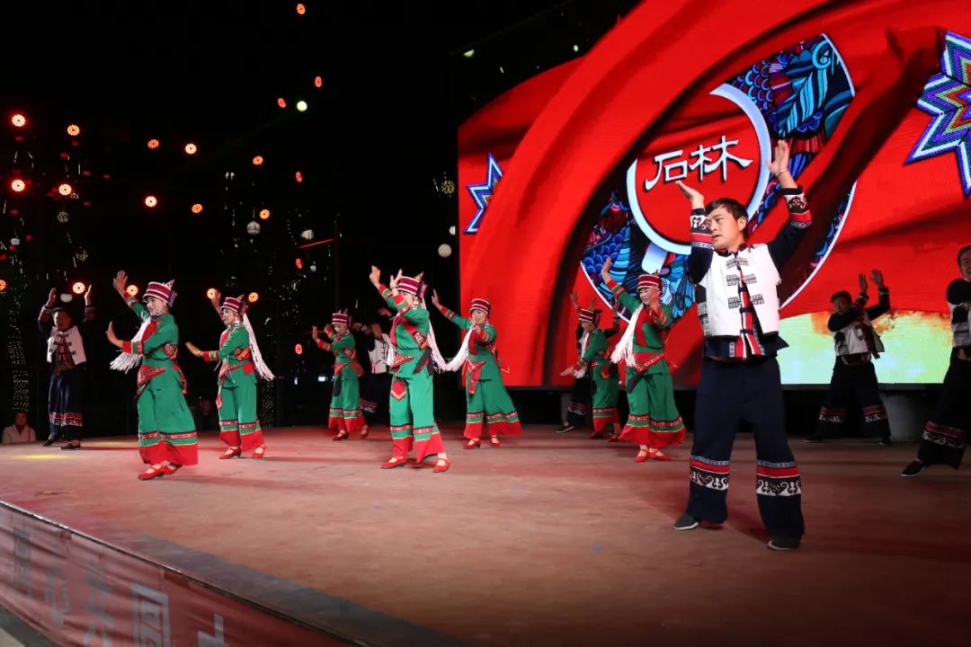 大年初二到初五,每晚八点,石林五棵树村民族团结广场都上演极具当地特色的“村晚”、篝火晚会等活动,石林街道各地群众自编自演的节目高潮迭起;台下,观众挨挨挤挤,孩子被扛上肩膀,后排村民纷纷站上了板凳,台上在闹,台下在笑;篝火活动现场当地群众与五湖四海的游客手拉手,围着篝火跳起来,共度美好时光。村民自编自演的“村晚”,不同于年节“送戏下乡”,而是“放下锄头去排练、放下筷子当演员”,村民们有了自己成为“民星”的舞台。