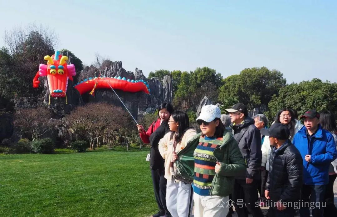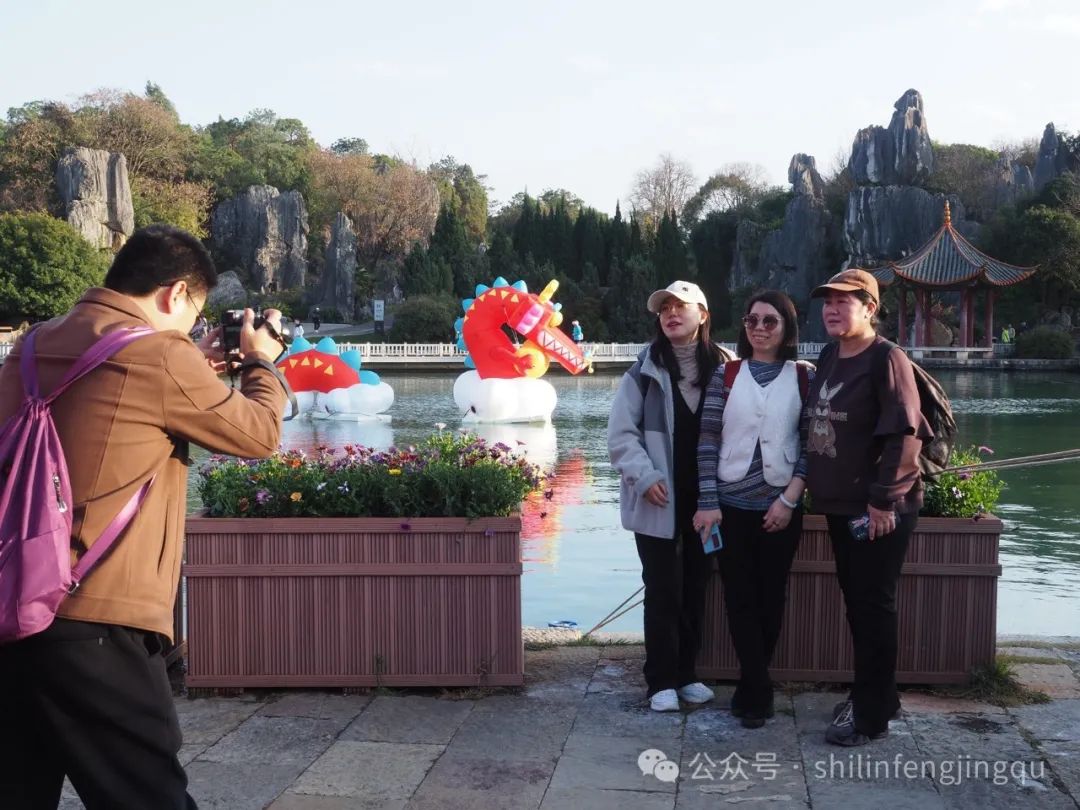 上午,带着家人直奔石林景区,可能是到得有点晚,没有看到撒尼迎宾仪式、龙形花车巡游等活动,有点遗憾。但好在石林景区里到处弥漫着龙年新春的喜庆气息,周围的游人都在兴高采烈地围绕着各种可爱的龙形国潮打卡点进行拍照留影。