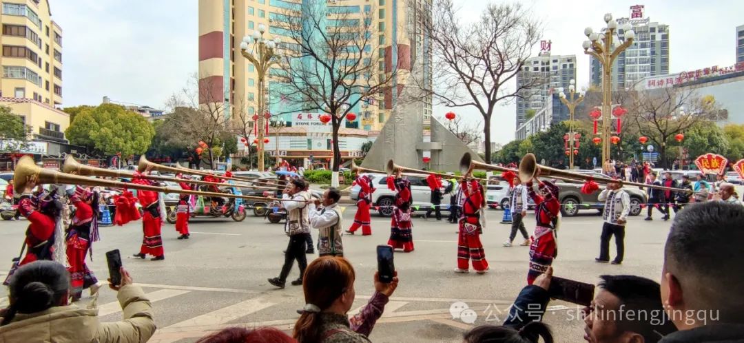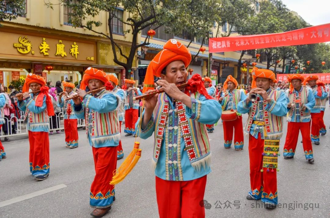 刚到阿诗玛转台旁的双龙广场, 咚咚咚、锣鼓声、长号声、三弦声响起,巡游活动开始了。
