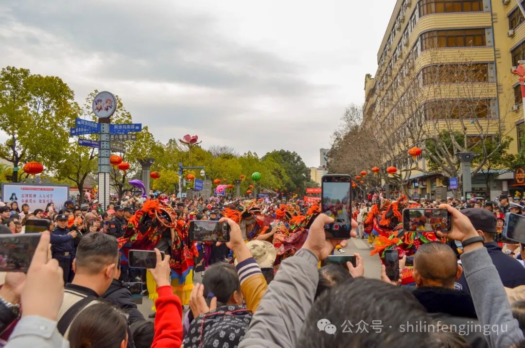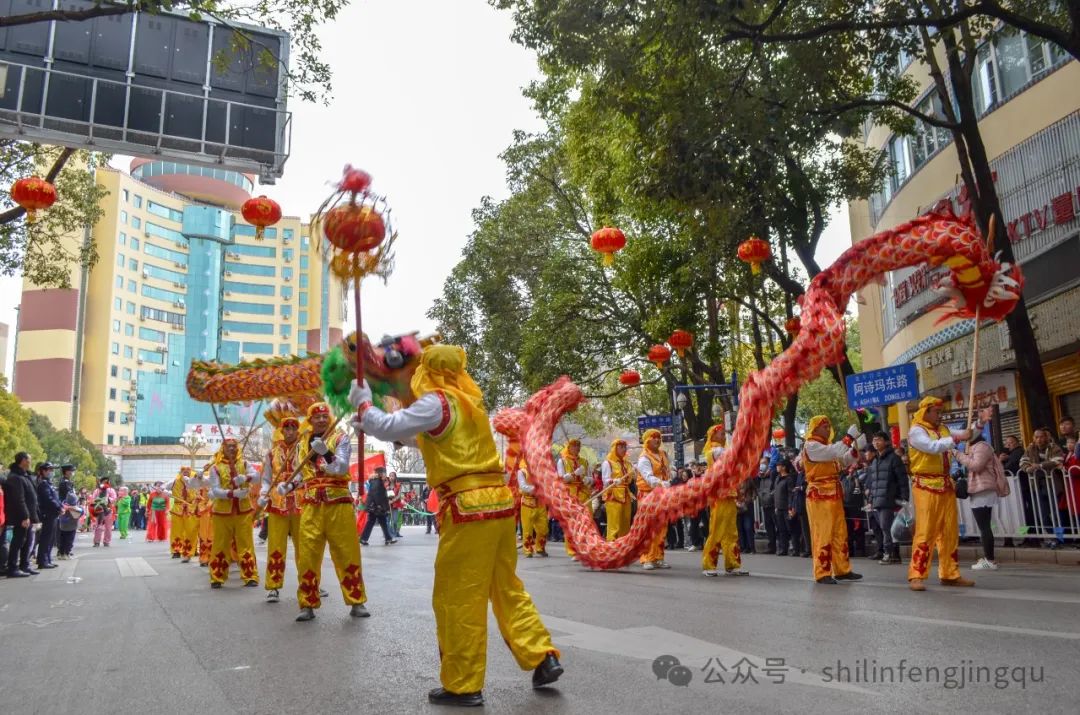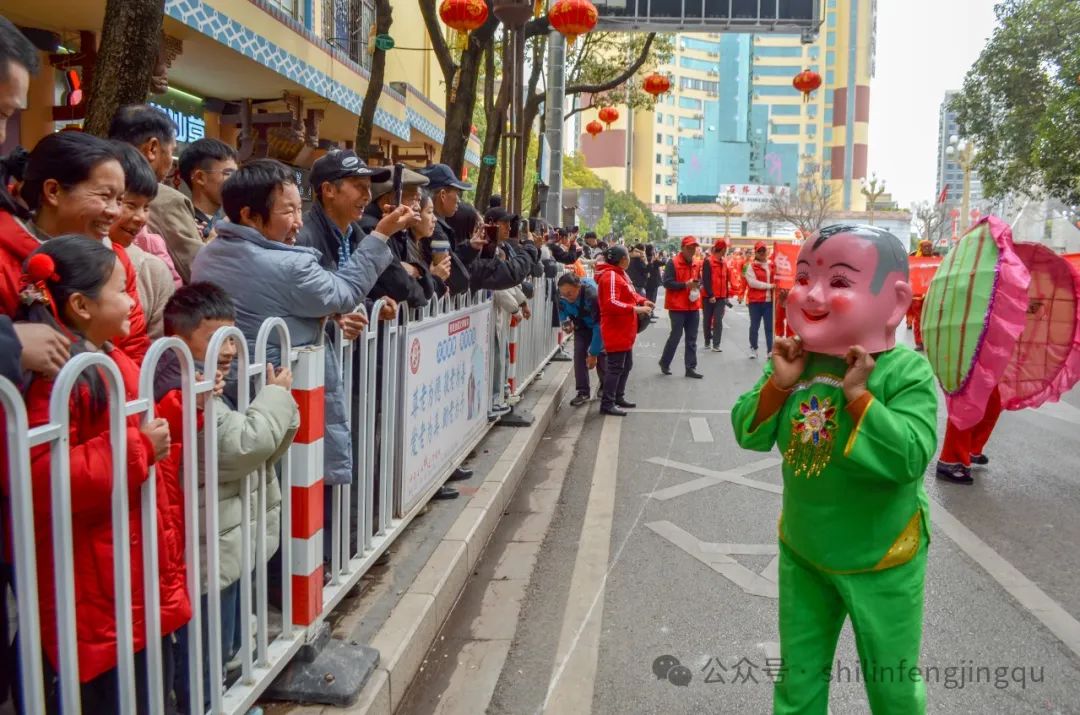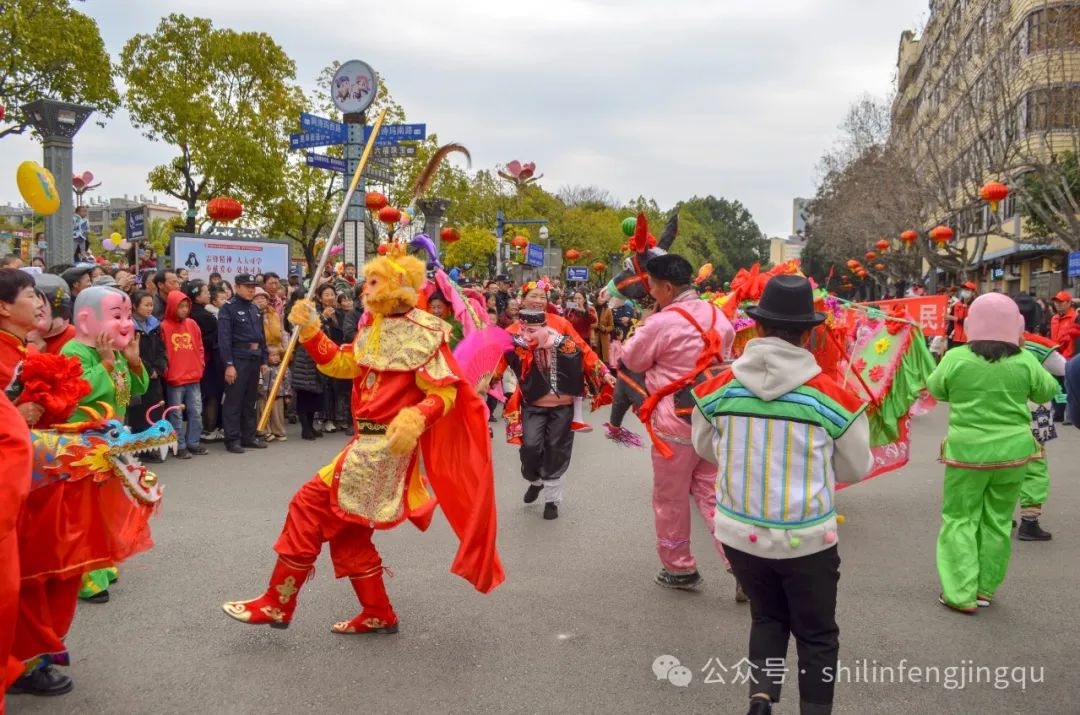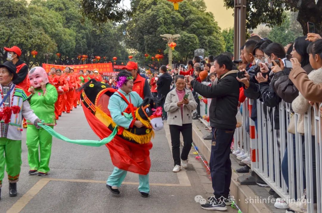 秧歌队也欢快地跳着来了,每个脸上都洋溢着喜欢的笑容,狮舞队也到了,鲜艳浓烈的狮身色彩格外醒目,随着锣鼓声律跳跃奔腾,很有气势。
