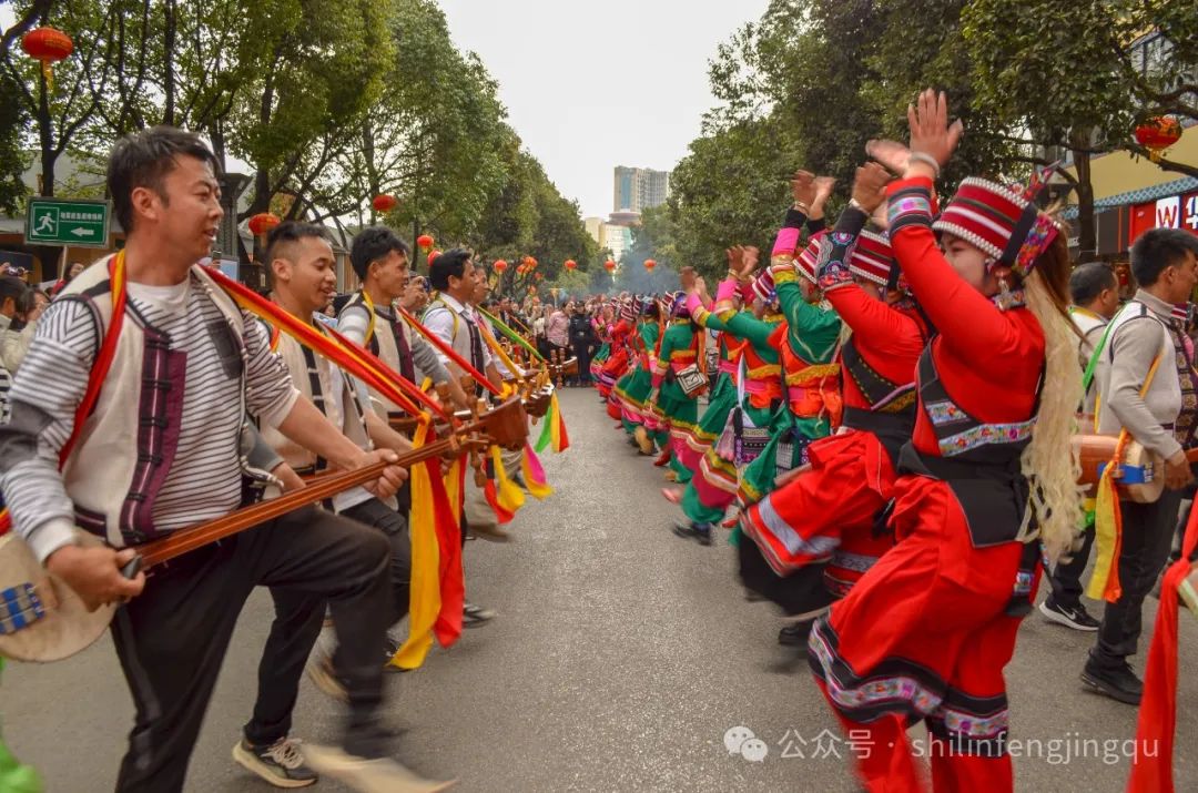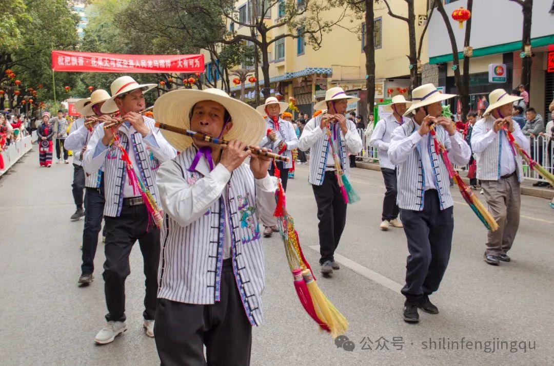 巡游队伍中最后收尾压场的还是当地最具代表和特色的彝族撒尼大三弦舞方队,欢快的旋律,热情奔放的舞步,阿黑哥和阿诗玛越跳越起劲。