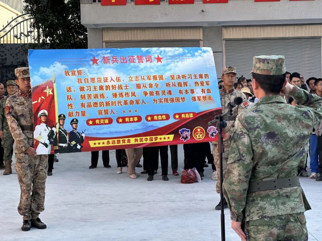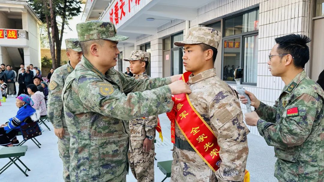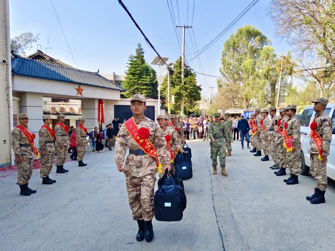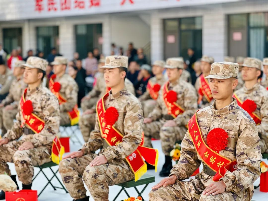 欢送现场气氛热烈,围满了前来欢送入伍新兵的家属们。35名身着戎装、肩披绶带的入伍新兵精神抖擞、目光坚定,对即将到来的军旅生涯满怀信心。