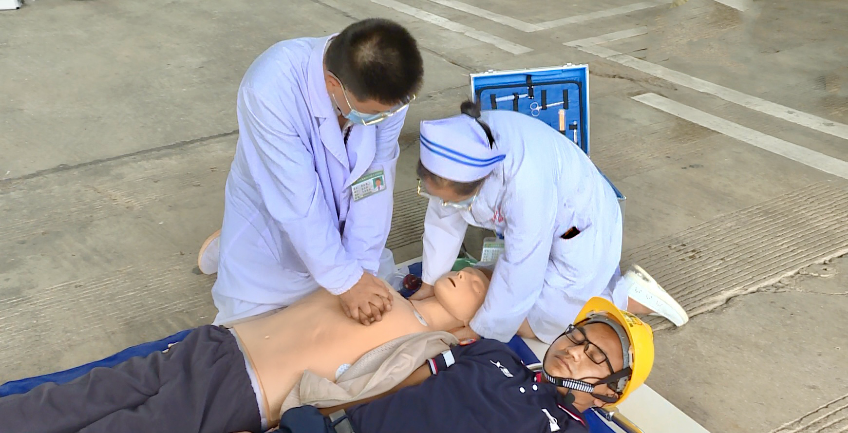 演练开始后,各路应急救援力量相继入场。通信联络组负责拨打120急救中心电话;救护组使用防爆风机进行通风,使用气体检测仪进行监测,并迅速转移伤员到安全区域,实施心脏复苏救护;警戒组负责指挥救援车辆进入,进行交通管控;120医疗救护队到达现场对伤员进行生命体征检查和伤情检查、开展医疗救治。