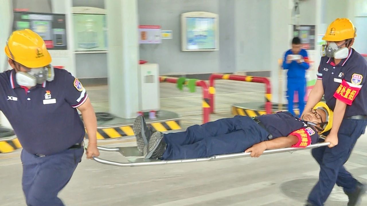 演练背景设定华源站班长对油罐操作井进行设备巡查、清洁维护,由于没有提前打开井盖通风透气就直接下井,还未佩戴防护面罩,进入操作井五分钟后呼吸困难晕倒。