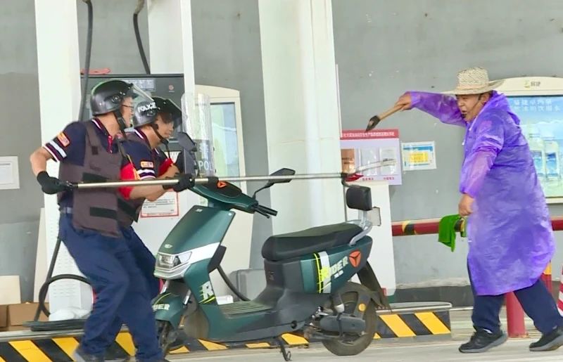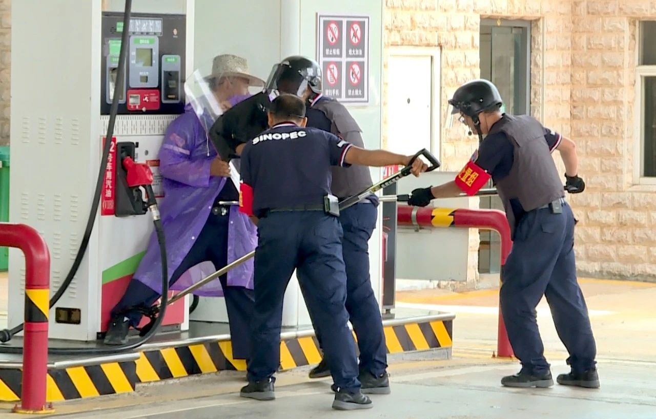 随后,还进行了反恐应急演练和火灾事故应急救援。反恐应急演练中,一名未携带身份证的男子向加油站员工要求加注散装汽油,拒不配合实名登记,便与加油站员工发生争执,情绪失控掏出刀具,预谋攻击在场人员,加油站员工第一时间拉响警报,并迅速拨打110和120,现场处置组分别用钢叉、防爆器材与男子搏斗,待民警接警后火速赶到现场,迅速根据现场情况进行指挥调度,成功将男子制服,紧接着120医疗救护队对受伤的人员开展紧急救治工作。