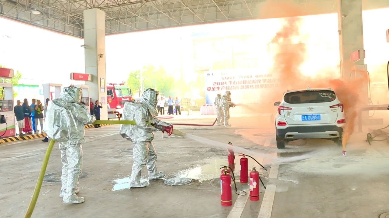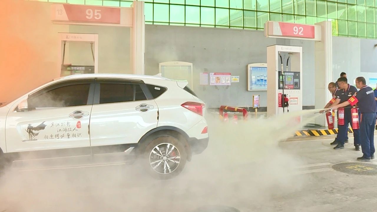 在模拟加油站车辆发生火灾的情境中,为模拟火灾场景真实性,工作人员在预定起火点燃放了烟雾弹,发生火情后,加油站员工立即停止加油、关闭电源并迅速拨打119火警电话,同时各应急小组迅速行动、分工协作,提起干粉灭火器,对准火焰根部,左右扫射……随后消防车迅速赶到,短时间内扑灭火焰。整个演练过程井然有序,现场观摩人员认真学习并互相交流好的经验做法。