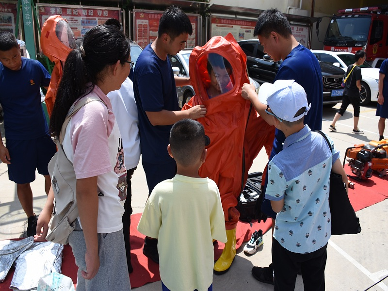 “教学式”讲解装备器材。哇,好大的消防车!”“叔叔、叔叔,这个是什么呀?”“这个叫做空气呼吸器,当火场有被困人员时,消防员叔叔就会带上这个面罩进火场救人”“这套橙色的衣服叫做抢险救援服……”在小朋友的好奇提问中,大队消防救援人员用简单易懂、风趣幽默的语言为小朋友们讲解了各种消防车的用途功能、防护装备、救生器材的用途、性能和使用方法等。“我要穿消防服”“我也要,我也要……”小朋友们争先恐后,在消防员的帮助下戴上消防头盔、穿上抢险救援服或是灭火战斗服,做了一回小小消防员,整个活动现场热闹非凡。