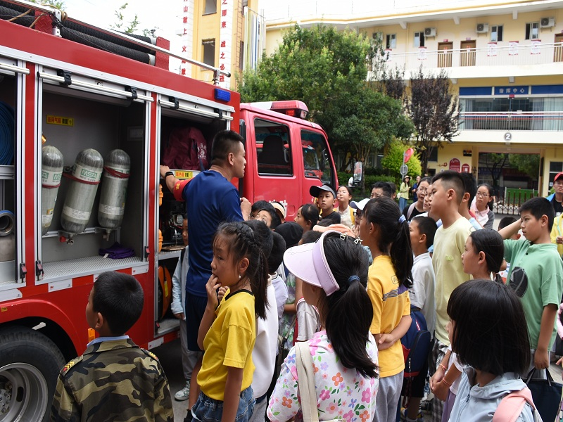 “互动式”消防知识课堂。“小朋友们,你们谁能告诉我发生火灾时应该拨打什么电话?”“火灾发生了我们应该怎么办?”消防救援人员的话音刚落,小朋友们争先恐后的回答“119,打119报警电话”“那小朋友知道怎么报警吗……”大队消防救援人员通过一问一答的方式让孩子们掌握了正确报火警、火场逃生以及灭火器使用的方法。随后,大队消防救援人员还向小朋友们展示了楼层内攻灭火操、绳索攀爬等训练科目,在场小朋友和老师们用最热烈的欢呼声和掌声表达了对消防员的敬佩之情。