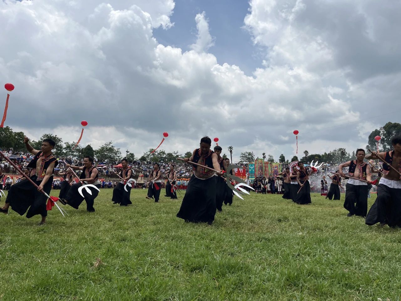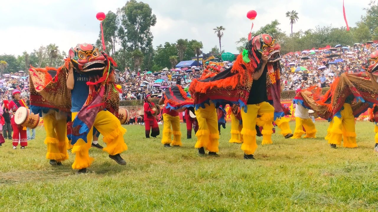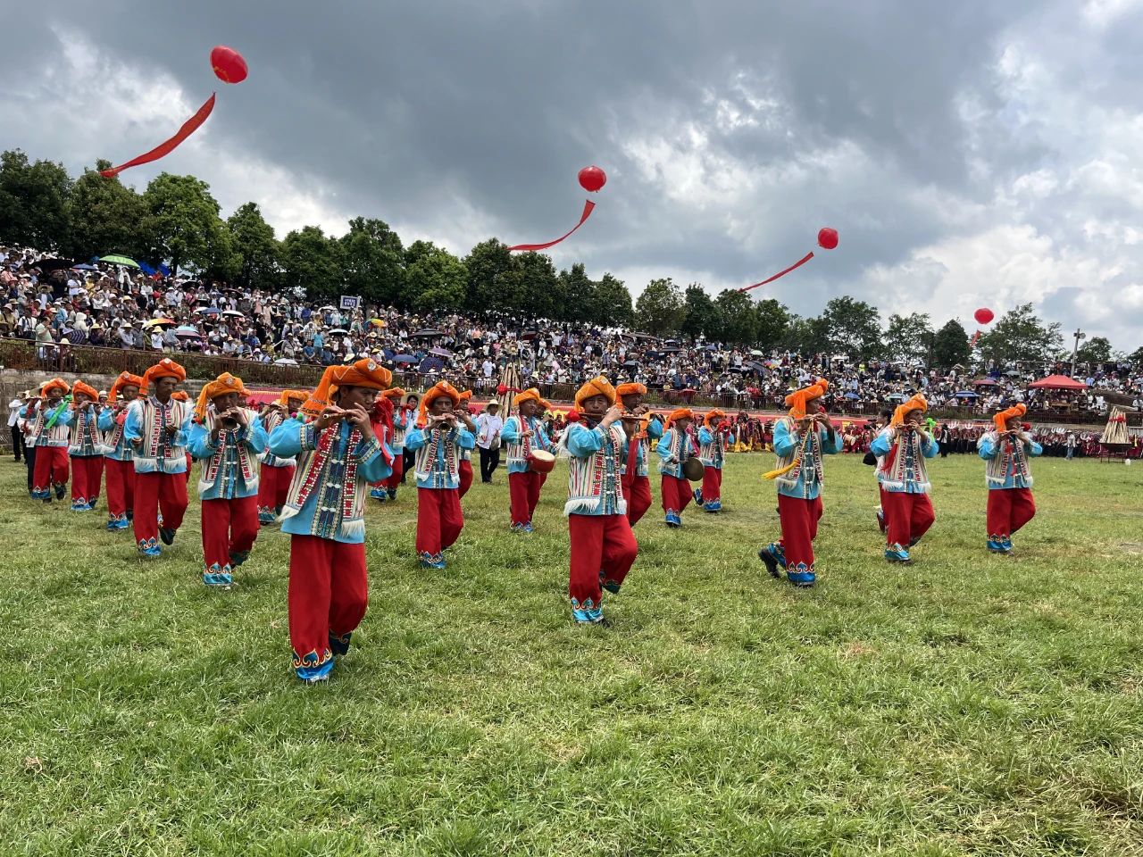 敲响祝福的铓锣,摇动祈福的铃铛,祈福队伍护送火把节神圣的火种步入会场,节徽、横标、过山号、旗幡队、彩虹队、鼓号队、细乐队、管乐队、狮舞队、叉舞队、霸王鞭舞队、鼓舞队、小三弦、大三弦舞队等民族文艺队依次入场,全面展示石林优秀传统民族文化。