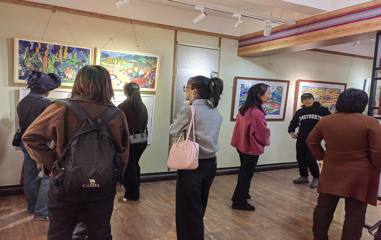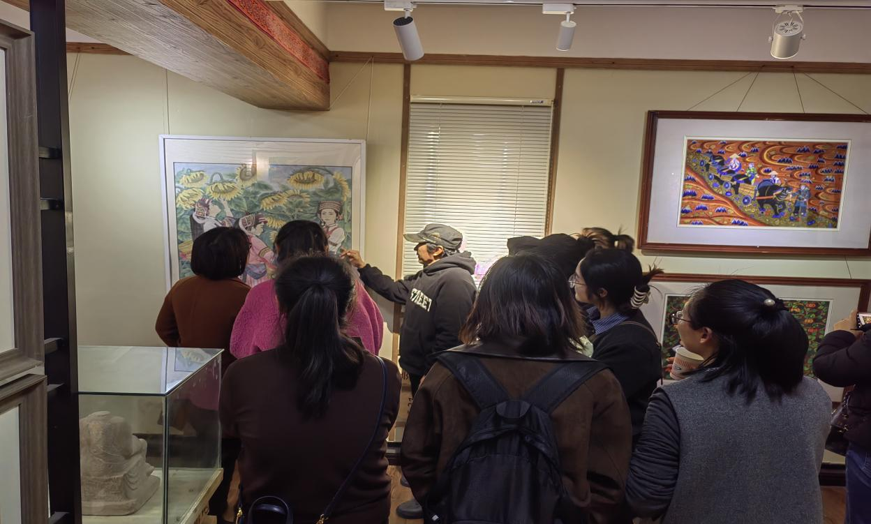 随后,教师们前往农民画馆,由市级非遗传承人金牛老师为他们详细讲解彝族农民画的起源、艺术特色。农民画色彩浓烈、构图自由、题材贴近生活,引得老师们驻足细赏、交流探讨。大家重点聚焦画作的色彩运用、构图技巧及文化内核,积极探寻可适配幼儿美术教学的元素与引导方法,为后续开展民族文化教学积累了鲜活素材。