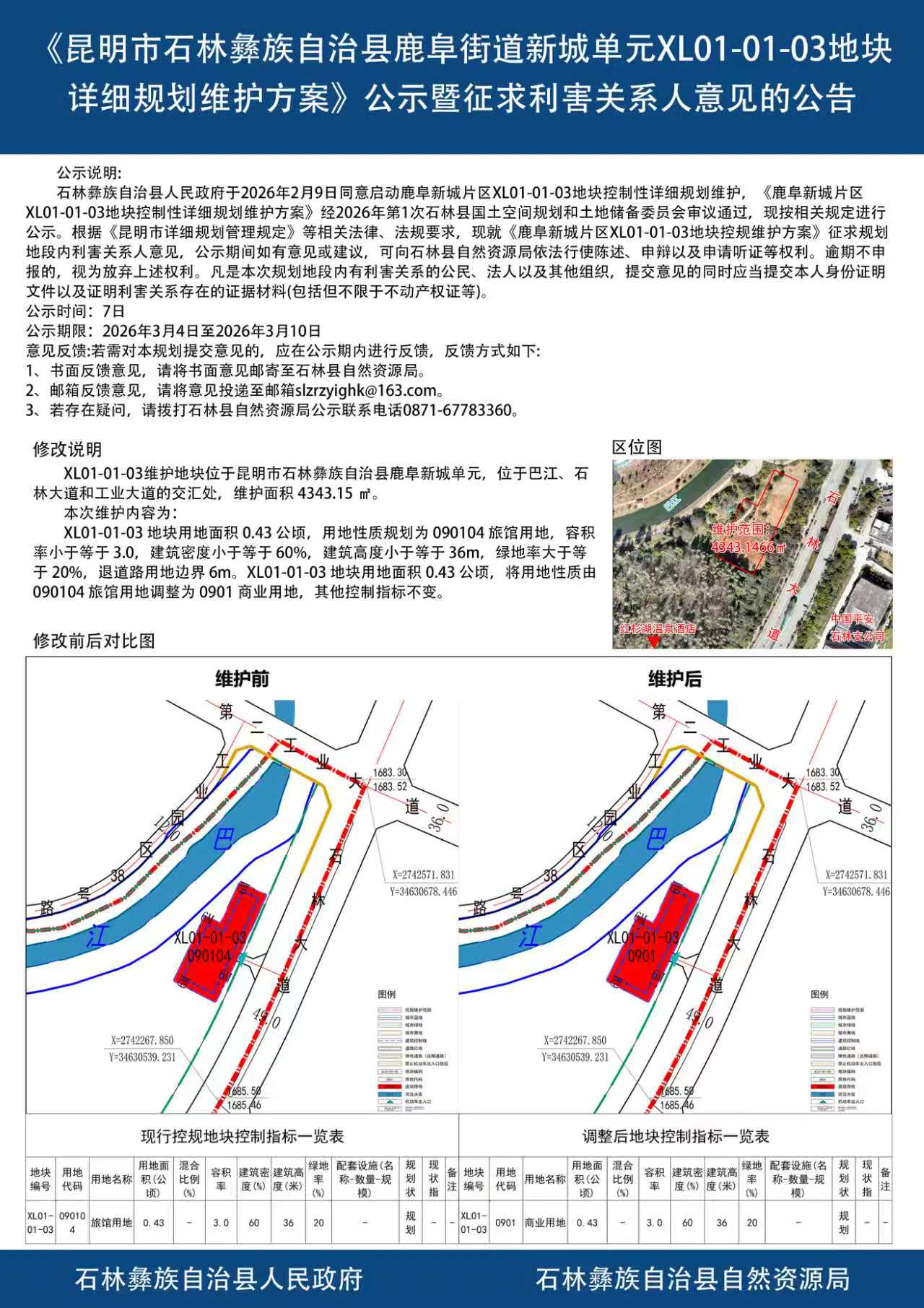 《昆明市石林彝族自治县鹿阜新城单元XL01-01-03地块详细规划维护方案》公示暨征求利害人意见的公告